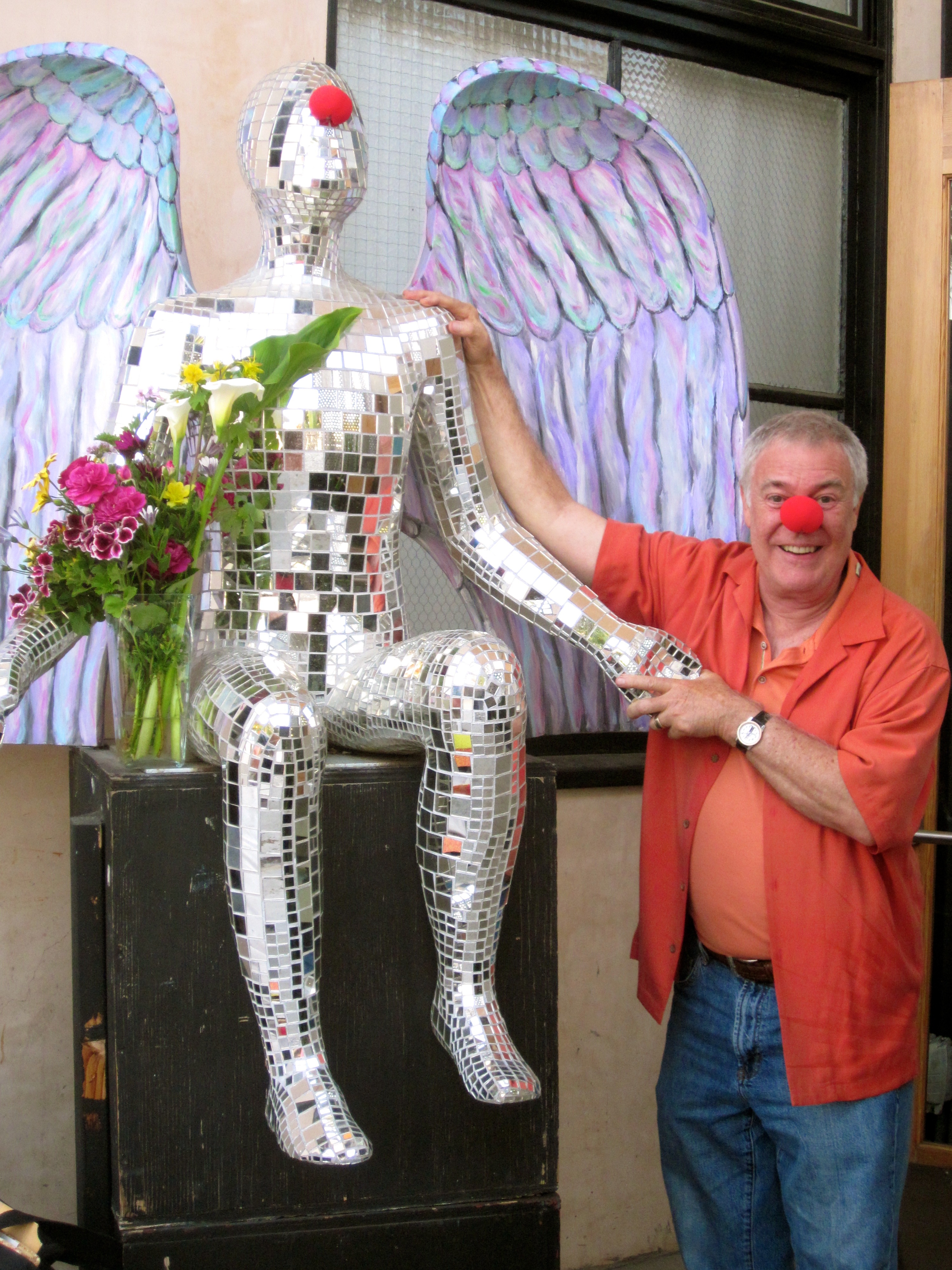 In honor of Peter and the Firesign Theater album “I Think We’re All Bozos on This Bus,” there were clown noses for everyone. As you can see in this photo of Phil, even the mirrored angel wore a red rubber nose in memory of Bergman.